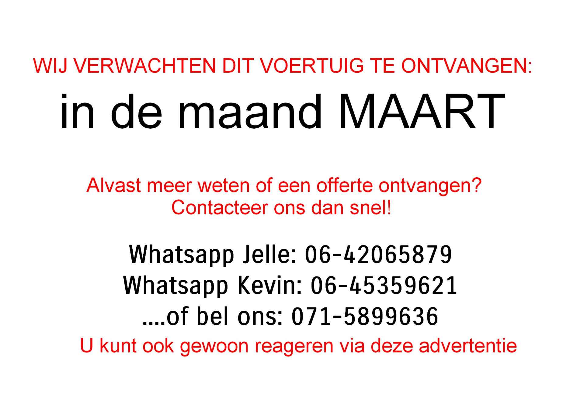 SNEL CONTACT MET ONS? Stuur ons dan direct een whatsapp. Jelle: 06-42065879 Kevin: 06-45359621 Wij reageren zo spoedig mogelijk op uw bericht. Wij zijn ook gewoon bereikbaar buiten openingstijden. Elke auto bij Suzuki Leiden wordt geleverd zonder extra aanvullende kosten. Wij hebben dus geen 'afleverpakketten' of andere verrassingen. Elke auto wordt bij ons rijklaar geleverd, inclusief een onderhoudsbeurt, een lange APK (minimaal 1 jaar geldig), een complete technische controle, een volle tank, Europese mobiliteitsgarantie en garantie (tenzij anders aangegeven). Dat betekent dat u bij ons altijd zorgeloos kunt wegrijden. Wij zijn al sinds 1998 officieel Suzuki-dealer voor de regio Leiden. Naast ons Suzuki-dealerschap, zijn wij universeel garage en importeren wij wekelijks gebruikte voertuigen uit o.a. België, Denemarken, Zweden en Luxemburg. Elke auto die wij importeren, wordt handmatig uitgekozen en persoonlijk geïnspecteerd. Wij kunnen daarom op al onze auto's de kilometerhistorie en ongeval-vrijheid garanderen. Een auto uit het buitenland moet wat ons betreft kloppen qua historie. Doet hij dat niet, dan halen we hem niet naar ons toe. Heeft u een leuke auto gezien, maar mist u opties? Wij kunnen u helpen met het toevoegen van allerlei accessoires. Vraag onze collega's naar de kosten. Wij kunnen o.a. de volgende zaken voor u regelen: - Inbouw van een navigatiescherm - Het toevoegen van Android Auto/Apple Carplay - Inbouw van parkeersensoren voor of achter - Inbouw van Cruise Control - Montage van een trekhaak of een armsteun Wilt u proefrijden in één van onze wagens? Een proefrit is altijd vrijblijvend, u bent van harte welkom. Het liefst spreken wij hiervoor wel een datum en tijdstip met u af. Woont u ver weg? U hoeft maar één keer heen- en weer. Wij kunnen namelijk na het rijklaar maken de auto voor u op locatie afleveren tegen scherpe tarieven. Zien wij u snel in onze showroom? Wij kijken ernaar uit! Een vriendelijke groet van het team van Suzuki Leiden! Bart van der Ham (Directie) Jelle van der Vlugt (Occasions) Kevin Schuurhuis (Nieuwe auto's) Eelco Kooper (After Sales) Rob de Rooij (After Sales)